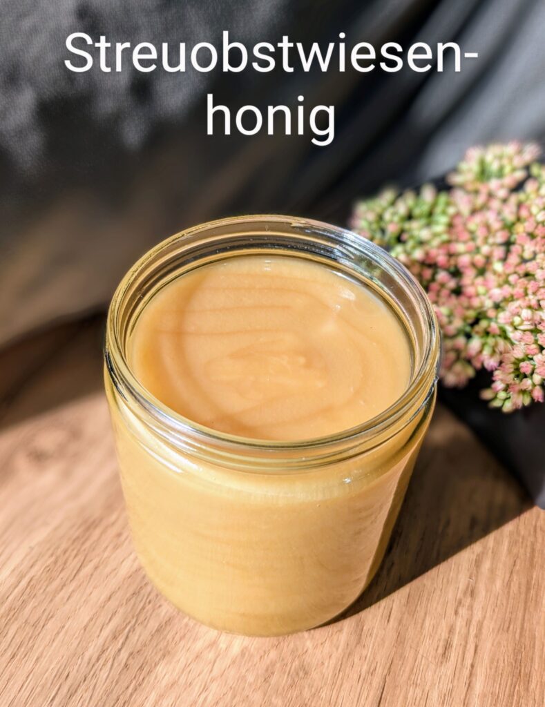 In diesem Sommer haben die Bienen fleißig Honig unserer Streuobstwiese gesammelt. Der Honig ist würziger als der milde Frühjahresblütenhonig. Er ist cremig gerührt.